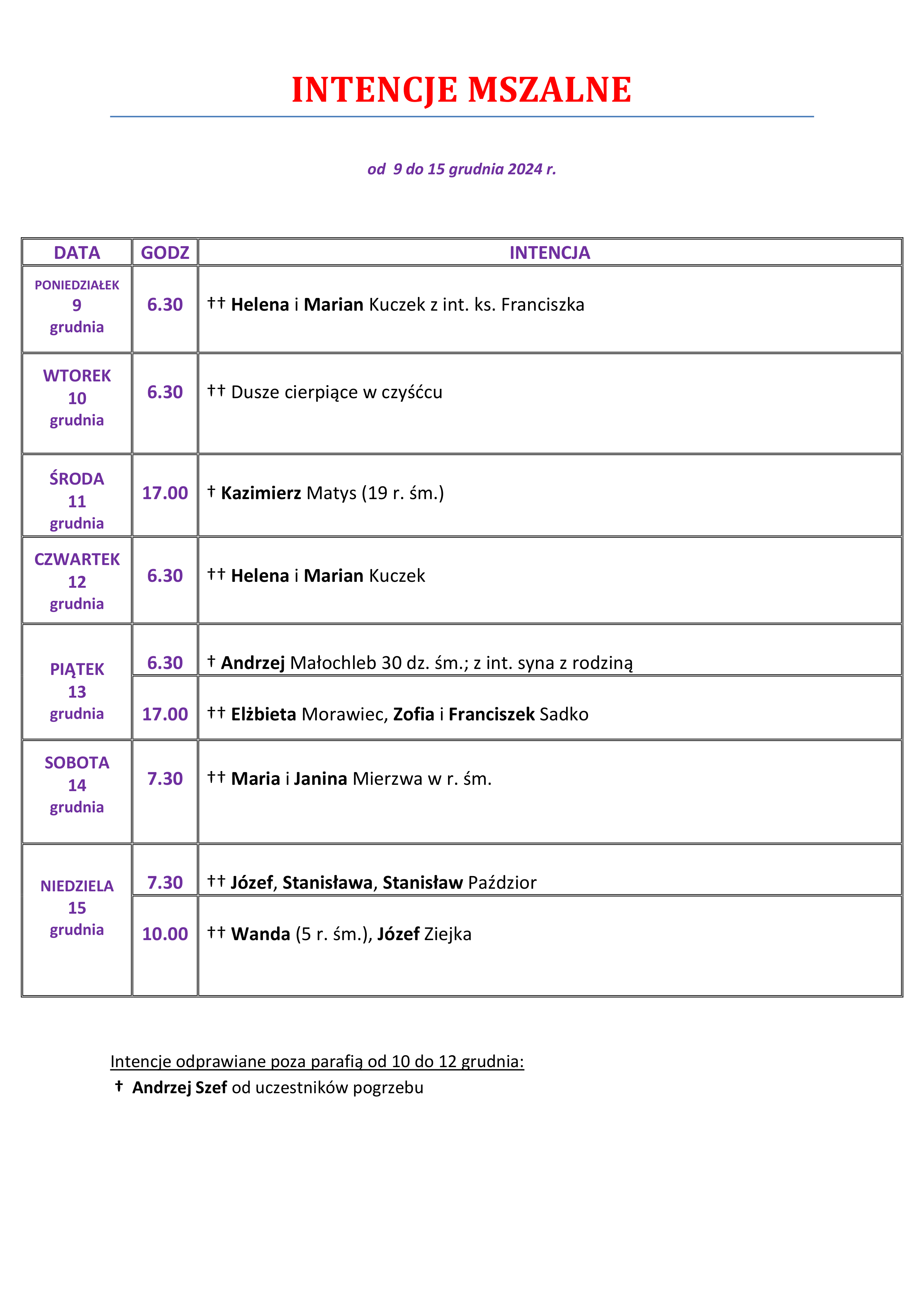 Intencje mszalne 09.12. – 15.12.2024 r.