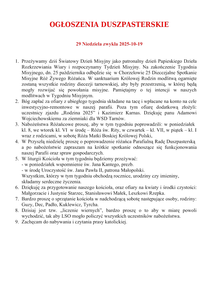 29. Niedziela zwykła – 19.10.2025 r.